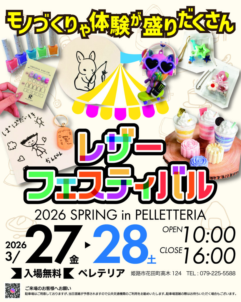 恒例の人気イベント「レザーフェスティバル」が、今年も27日(金)・28日(土)10時~16時に開催されます。レザー販売のお店はもちろん、物販や飲食のお店が約100店舗出店されて楽しさ満載!毎回豪華賞品が当たる福引もあるのでお見逃しなく!お子様向けの無料体験イベントもたくさんご用意しているので、ご家族お揃いでのご来場をお待ちしています!